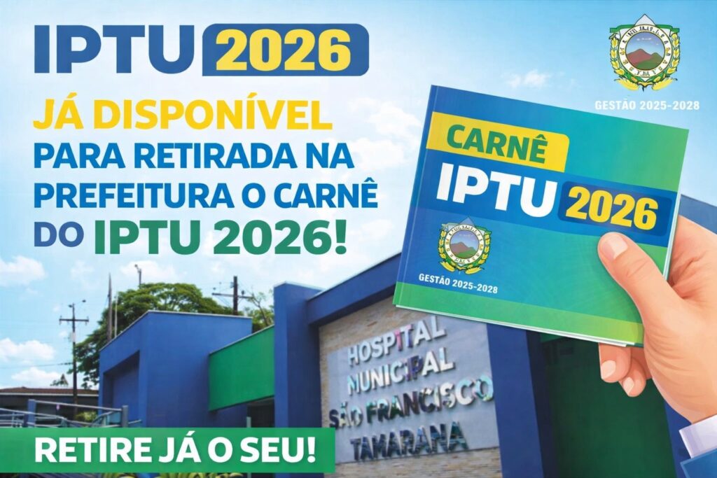 Já estão disponíveis para retirada, na Prefeitura de Tamarana, os carnês do Imposto Predial e Territorial Urbano (IPTU) referentes ao exercício de 2026. O vencimento ocorre no dia 11 de maio, com desconto de 5% para pagamento em cota única ou opção de parcelamento em oito vezes, sem desconto.
