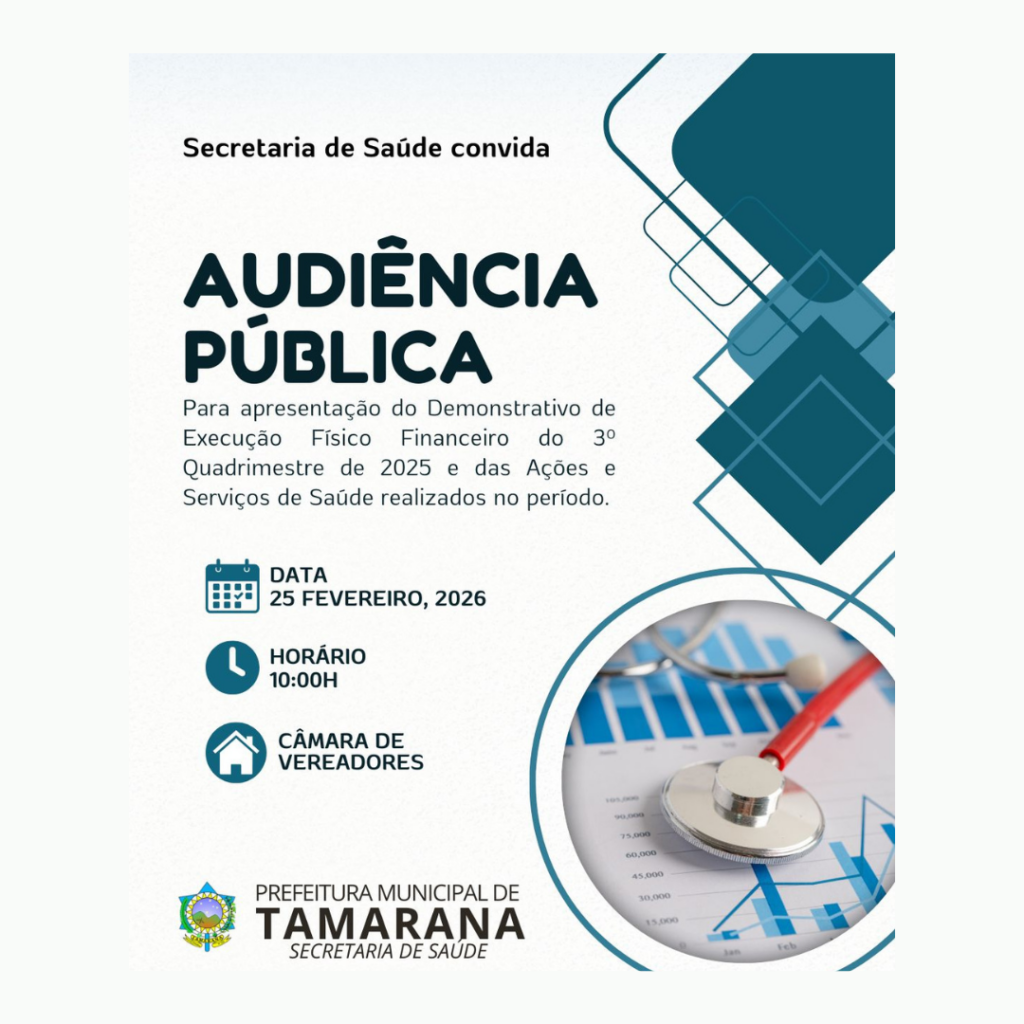 A Secretaria Municipal de Saúde convida toda a população para participar da Audiência Pública, que apresentará o Demonstrativo de Execução Físico Financeiro do 3º quadrimestre de 2025, bem como as ações desenvolvidas no período.