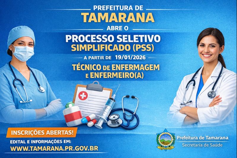 A Prefeitura Municipal de Tamarana, por meio da Secretaria Municipal de Saúde, torna pública a abertura de Processo Seletivo Simplificado (PSS) destinado exclusivamente a contratação temporária de profissionais, para atender à necessidade temporária e de excepcional interesse público da Secretaria Municipal de Saúde.